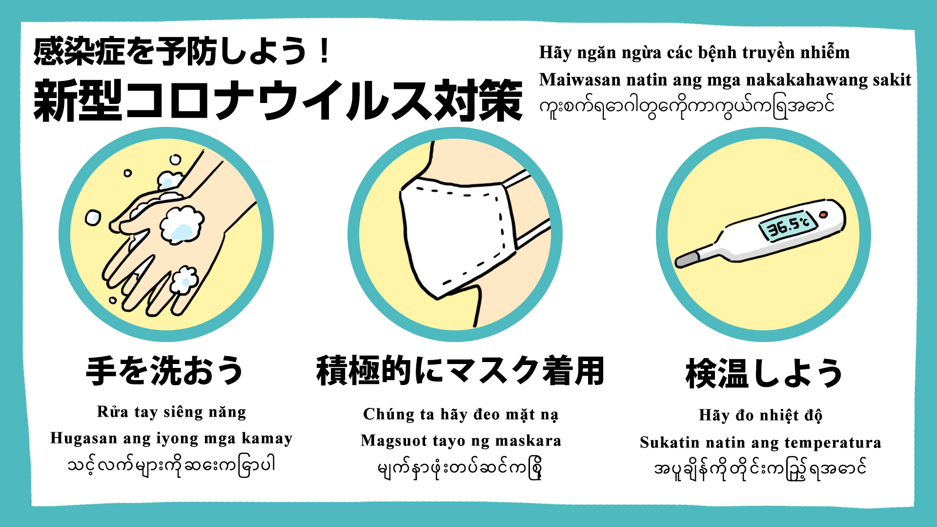 新型コロナウイルス感染症予防対策のポスターになります 現場入場時に消毒コーナー設置している現場の案内掲示にご利用ください。 こちらは日本語バージョンになります 多言語対応バージョンもございます。 多言 ...
