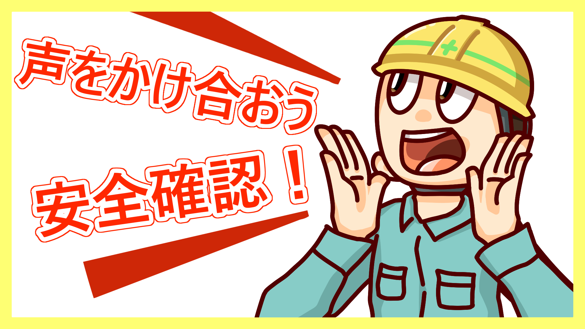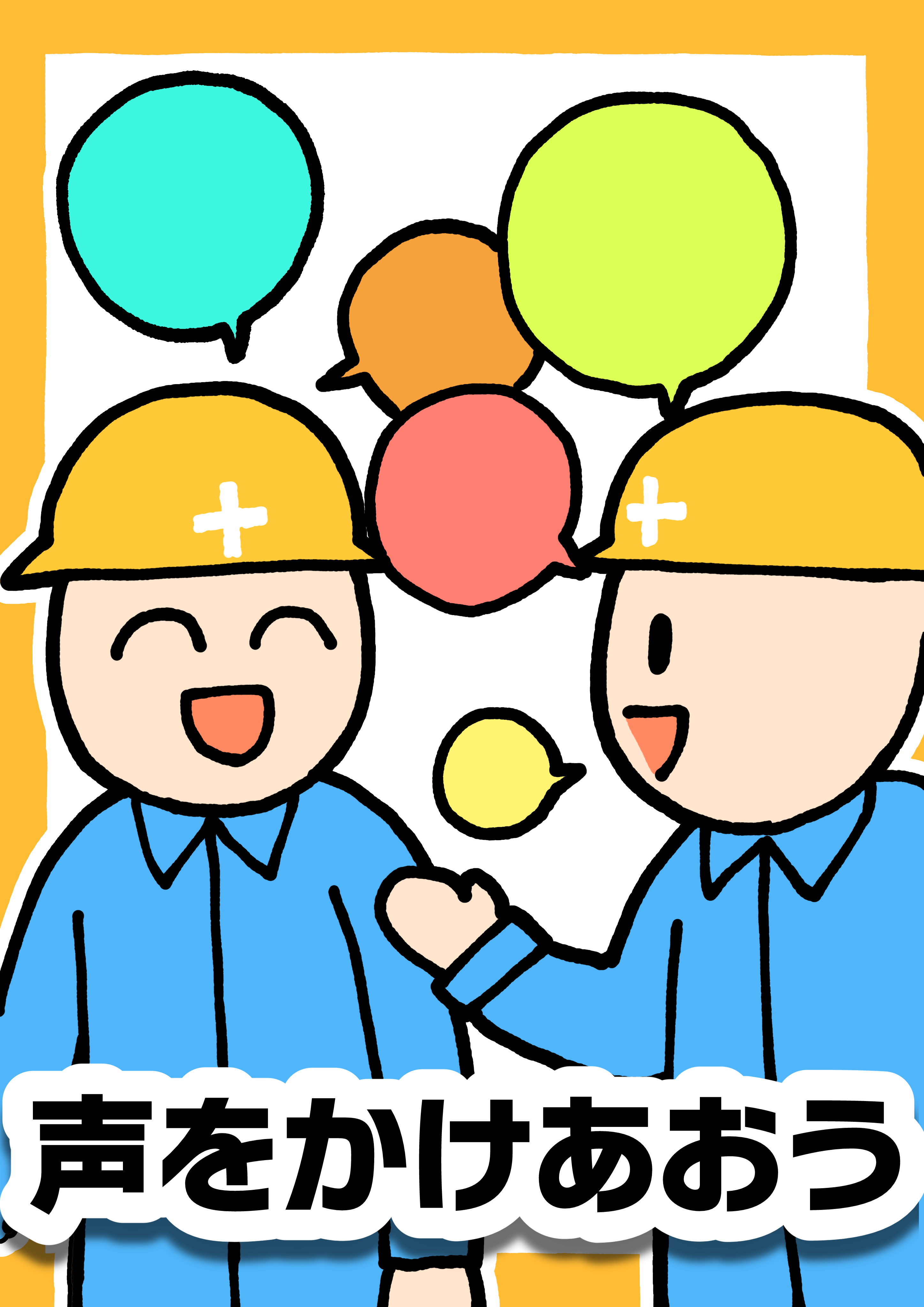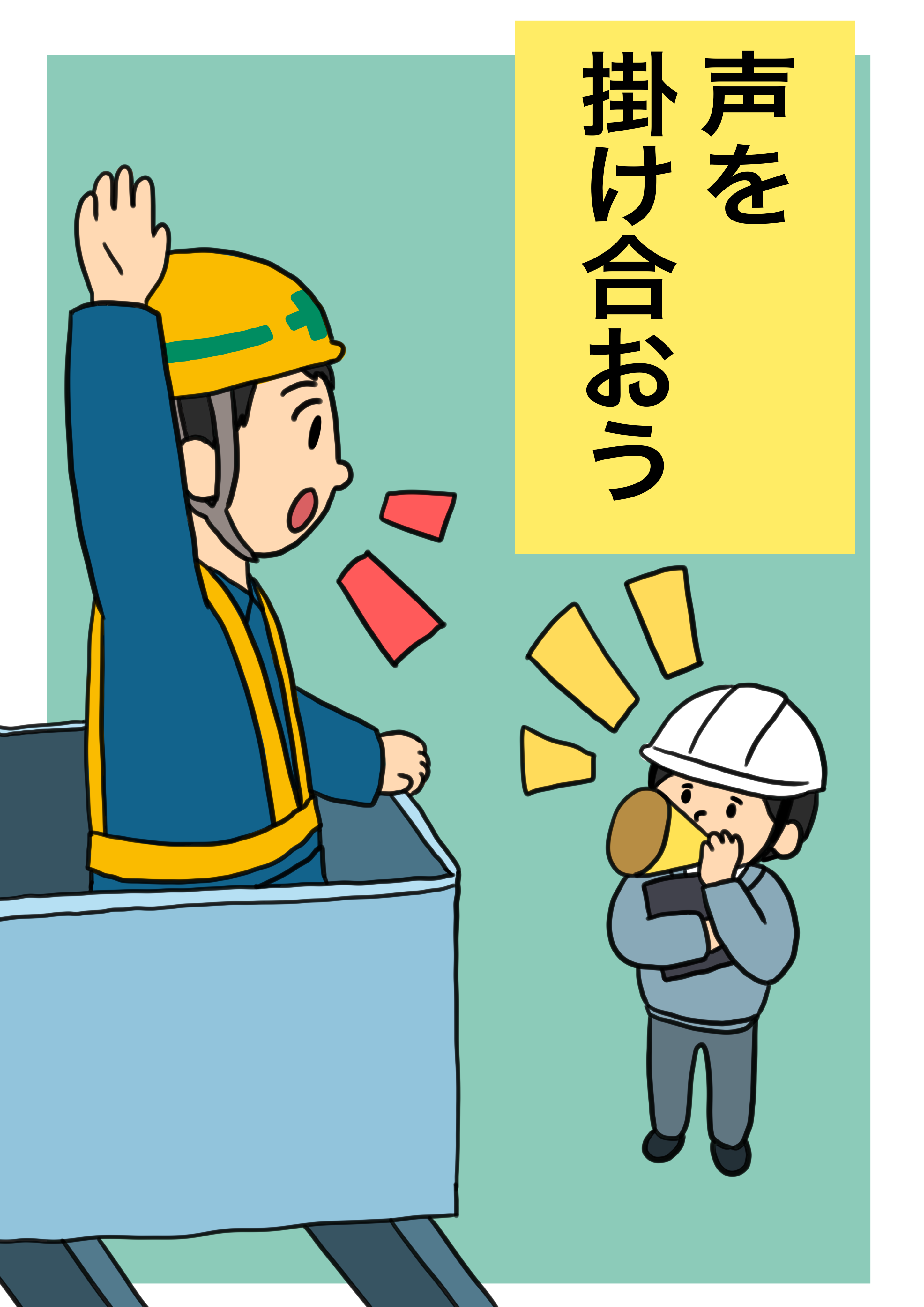 現場の安全を推進する取り組みの一環として公募した、建設現場、作業現場のポスター・イラストになります。 テーマは「声を掛け合おう」です。是非現場でご活用下さい。
